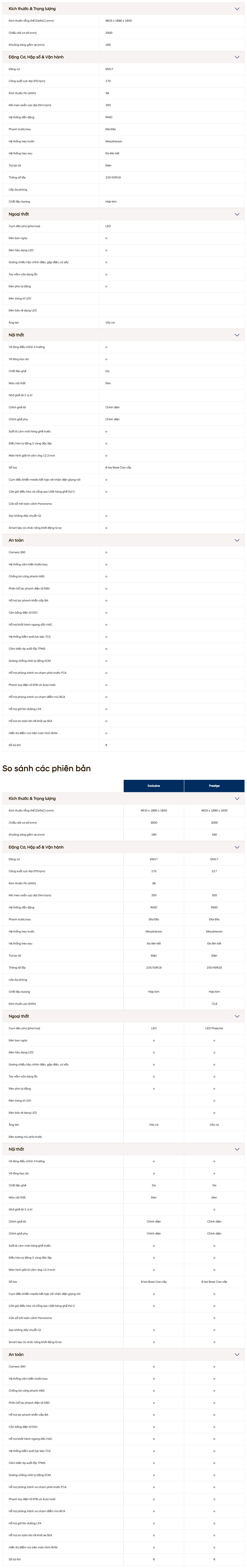 Tổng quan | Cảm nhận 360° | Models | Tính năng nổi bật | Ngoại thất | Nội thất | Vận hành | An toàn | Tiện nghi | Thông số